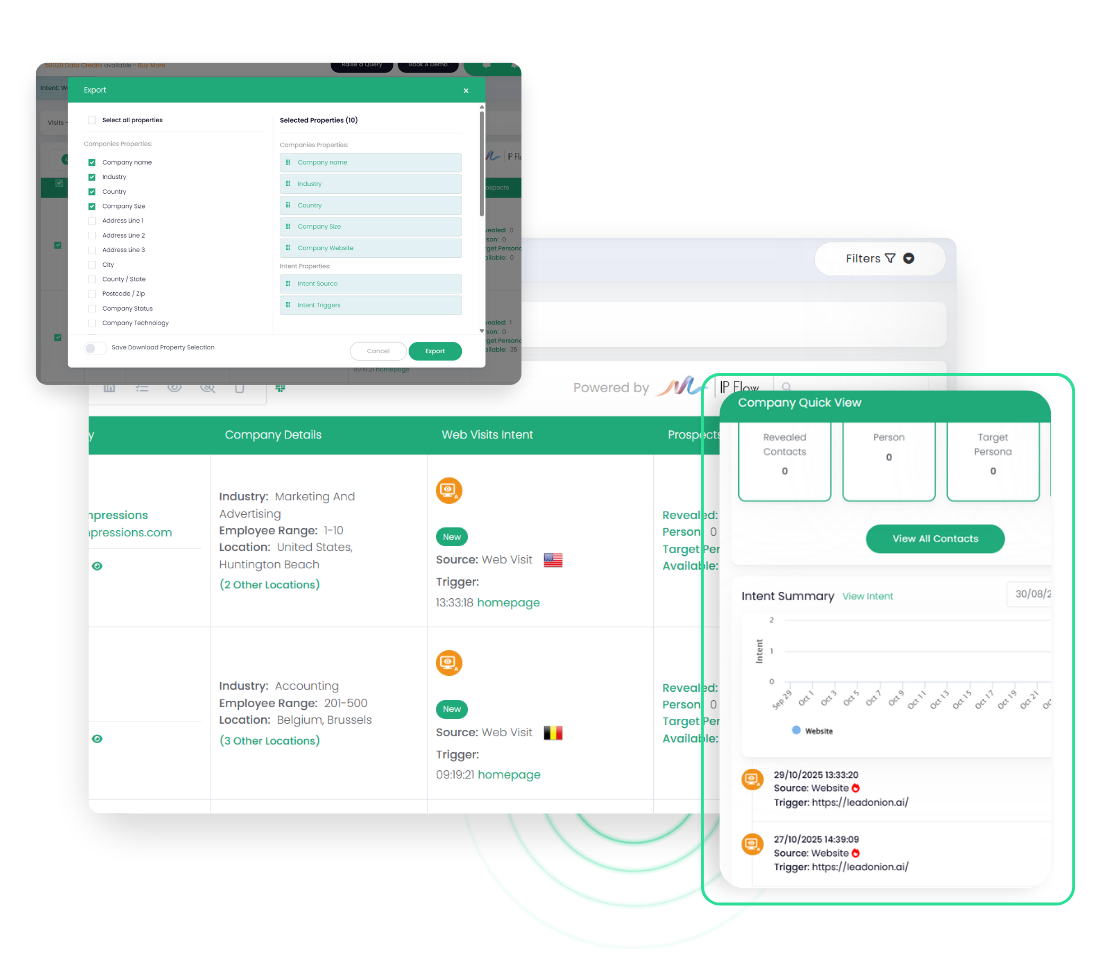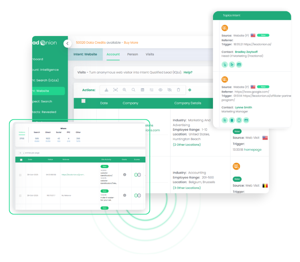 Identify which companies are visiting your site, see which pages they engage with most, and understand their level of buying intent. Lead Onion matches visitors against 1.4B+ verified IPs, so you can see exactly which organisations are actively researching your solutions, and prioritise outreach accordingly.